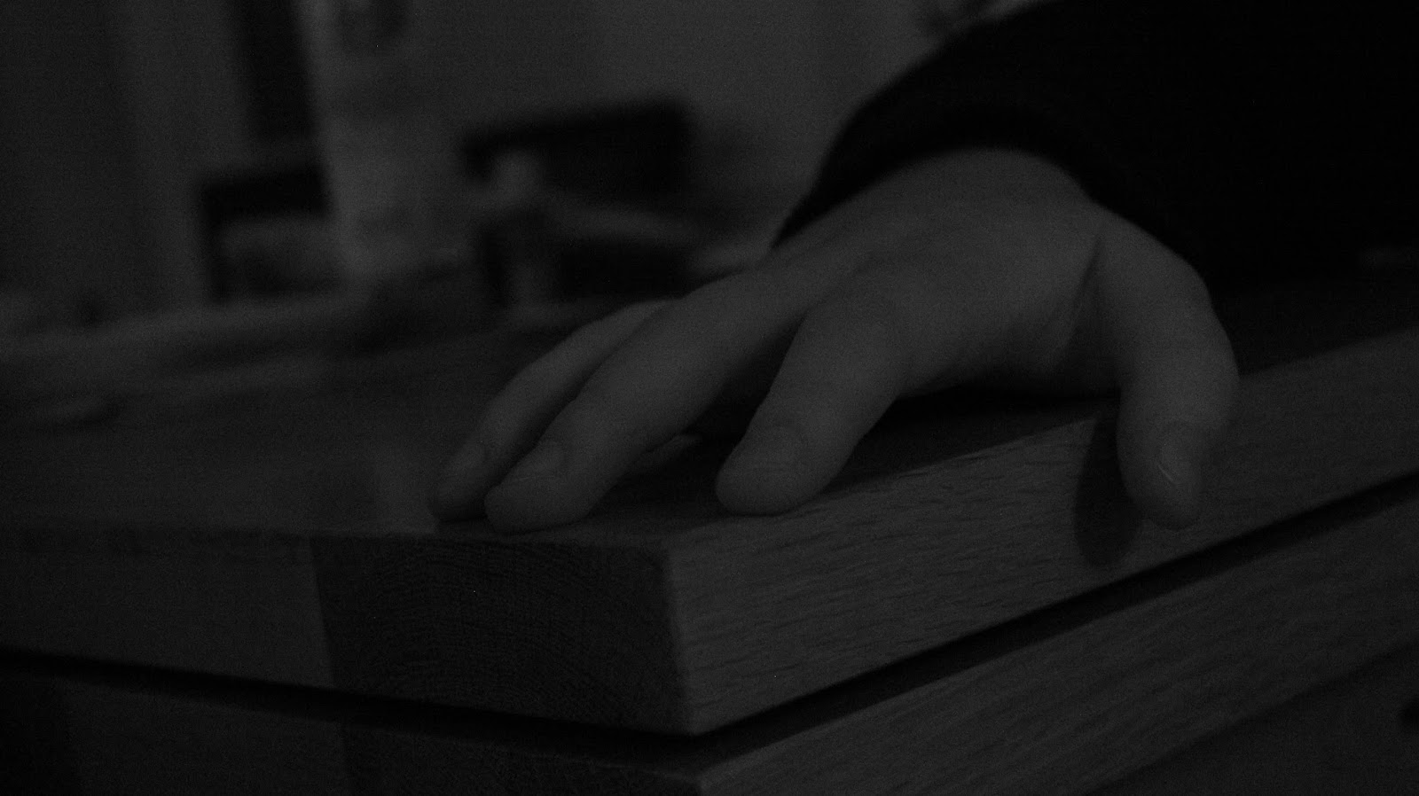 As I started my filming, I wanted to experiment with light - even though it was in the monochrome setting on the camera (Canon 600D). This set my film up to have an eery feel. The lighting was decided in this specific shot to be all lights off; but the LED light box added a small amount of light. This was just enough to light up the room to be able to see the hand above. This is a effective still to use as an example as it shows impatience to the film. The lighting used here will be the same lighting I will use for the majority of my inside shots/frames.